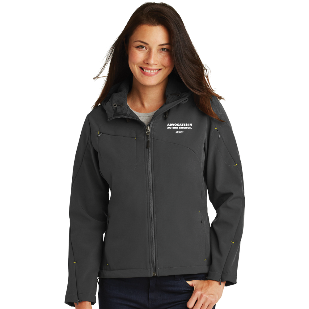 Our ladies' hooded soft shell jacket stands up to the elements and stands out with texture and bar tack details. Highly breathable and soft, this water resistant jacket is just right for the workday or the weekend. A hood and zippered sleeve vents add function and up-to-the-minute appeal.  Jacket is made of 96/4 poly/spandex woven shell bonded to 100% polyester micro-fleece with laminated film insert to repel water and wind.  Available in sizes XS-4XL with the Advocates in Action Council logo embroidered on the left chest.