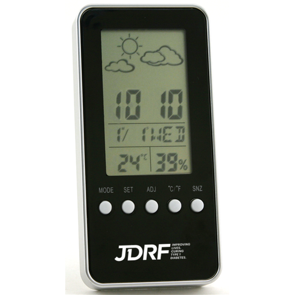 This easy-to-operate digital weather station/alarm clock displays the time (12 or 24 hour format), day, month, day of the week, year, indoor temperature (°F or °C), relative humidity, and a graphical weather forecast.  Unit can be used on a table top with the fold-out easel stand or hung on the wall with the recessed notch on the back. Operates on one button cell battery (LR1130) included. Gift boxed. Available in Black with the JDRF logo imprinted in full color below the buttons.