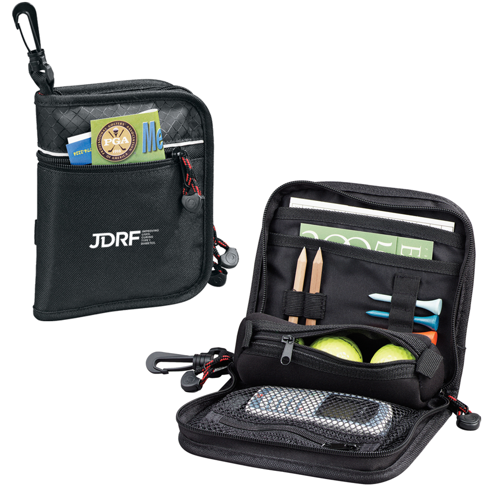 The golf pouch features a large ID window for golf scorecards, exterior zippered pocket, unzips to hold three golf balls in removable zippered pouch, attachments to secure six tees and divot replacement, and two additional interior pockets with quick clasp that attaches to standard golf bag D-rings. Available in Black with the JDRF logo imprinted on the front of the bag.