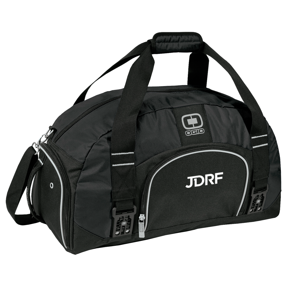 This 600D poly duffel has a large capacity for the gym or light travel. The cavernous interior easily holds a complete change of clothes and shoes. Duffel features a front zippered pocket, ventilated shoe compartment with grab handle, a detachable and adjustable padded shoulder strap, and a fabric-wrapped handle. Available in True Royal or Black with the JDRF logo embroidered on the side of the bag.