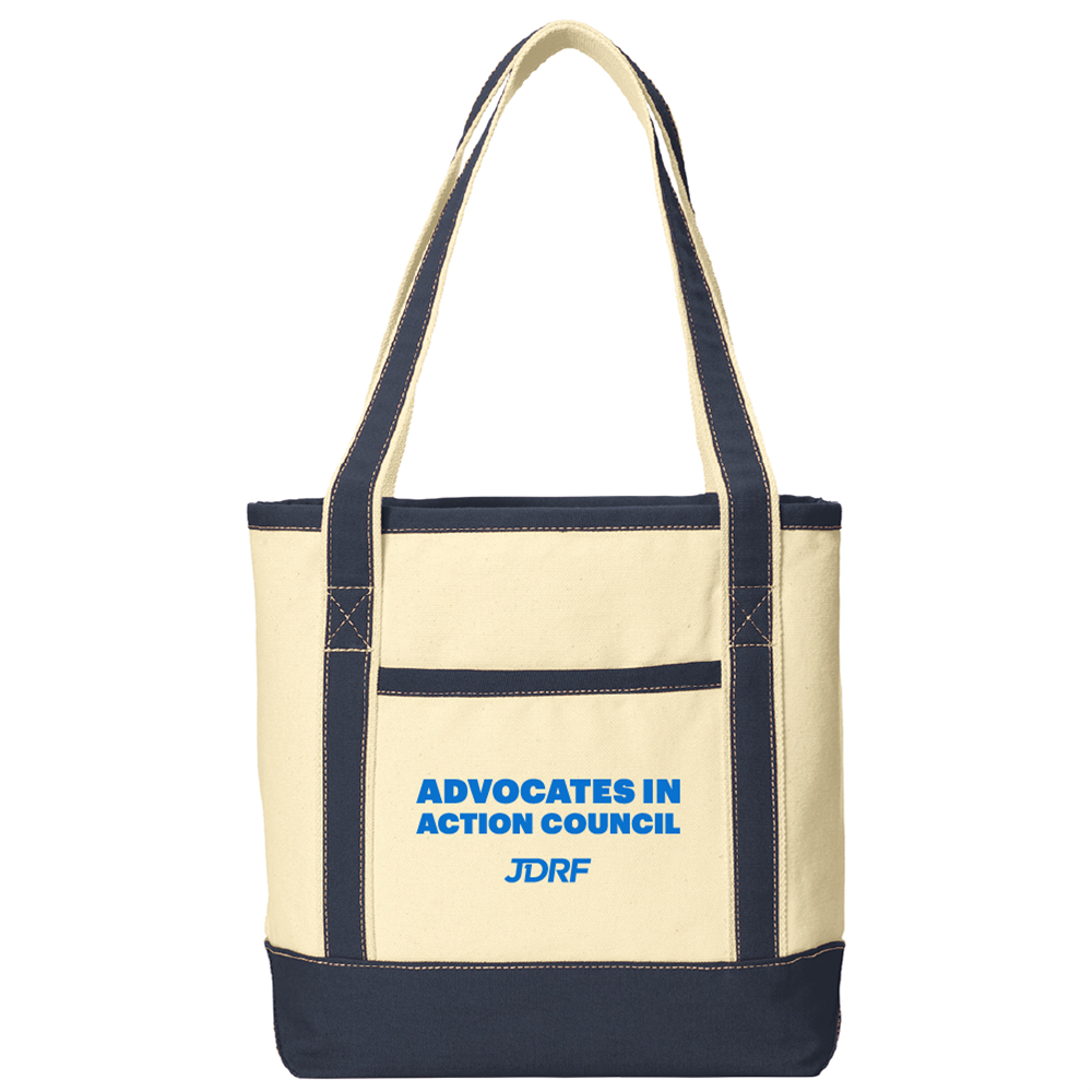 Perfect for the beach, shopping and events, these durable totes have open tops, contrast handles and contrast bottoms for classic good looks • 15.5-ounce, 100% cotton canvas body; 11-ounce, 100% cotton canvas handle trim and bottom • Sturdy, reinforced webbing handles • Exterior front pocket for easy decoration access • Interior hanging pocket with hook and loop closure to secure valuables • Dimensions: 13.25”h x 12”w x 6.25”d; Approx. 994 cubic inches. Natural/Navy Tote features the Advocates in Action Council logo imprinted on the side.