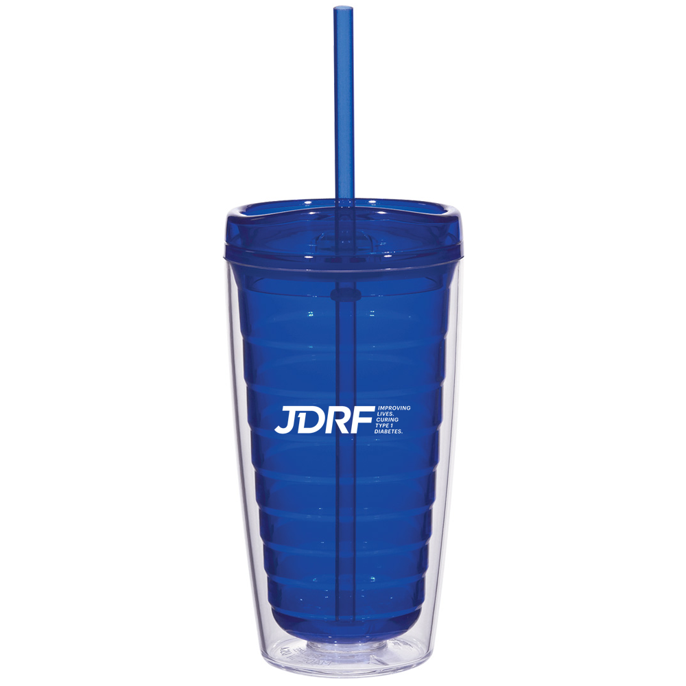 Keeps cold drinks colder longer and hot drinks hotter with this BPA free,16 oz. tumbler that has double wall construction for insulation of hot or cold liquids.  Made in the USA, this tumbler meets FDA requirements, and has a matching lid and 9" straw included. Hand Wash Only. Not Microwave or Freezer Safe.  Available in Translucent Blue with the JDRF logo imprinted in one color on the side of the tumbler.