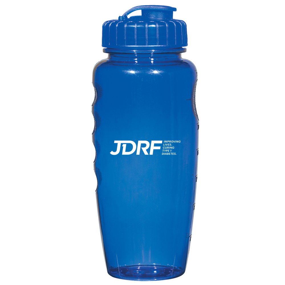 This BPA free 30 oz. gripper bottle contains no lead, meets FDA requirements and is made in the USA. Bottle include a leak-resistant super sipper lid and does not retain odor or taste. Not for use with hot liquids. Hand wash recommended. Available in translucent blue with the JDRF logo imprinted in one color on the side of the bottle.