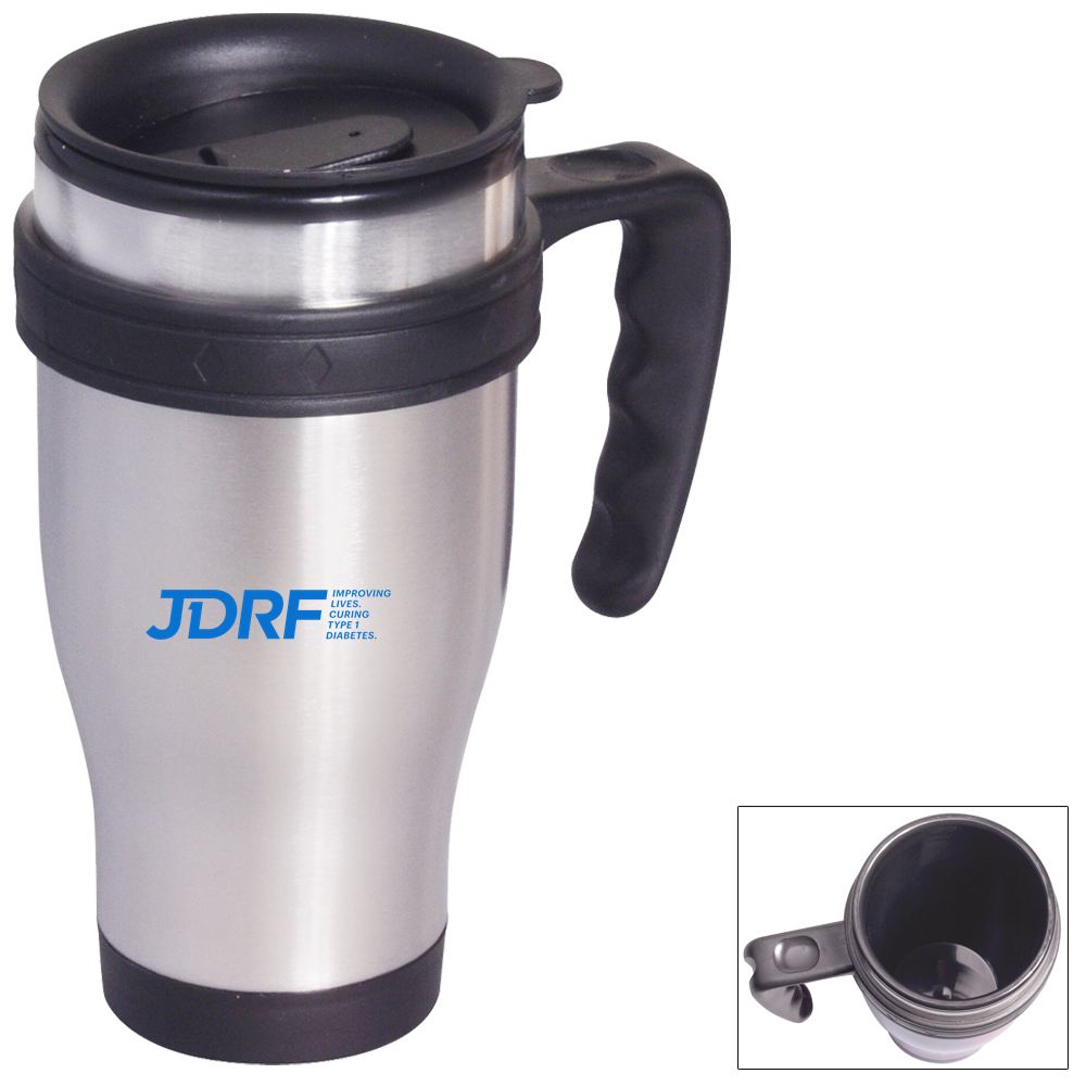 This 16-oz. stainless steel mug features solid stainless steel construction with plastic inner liner for insulation. Features snap-on slide open/closed lid, large-grip handle, and a rubber coaster bottom. Individually gift boxed. Available with the JDRF logo of your choice.
