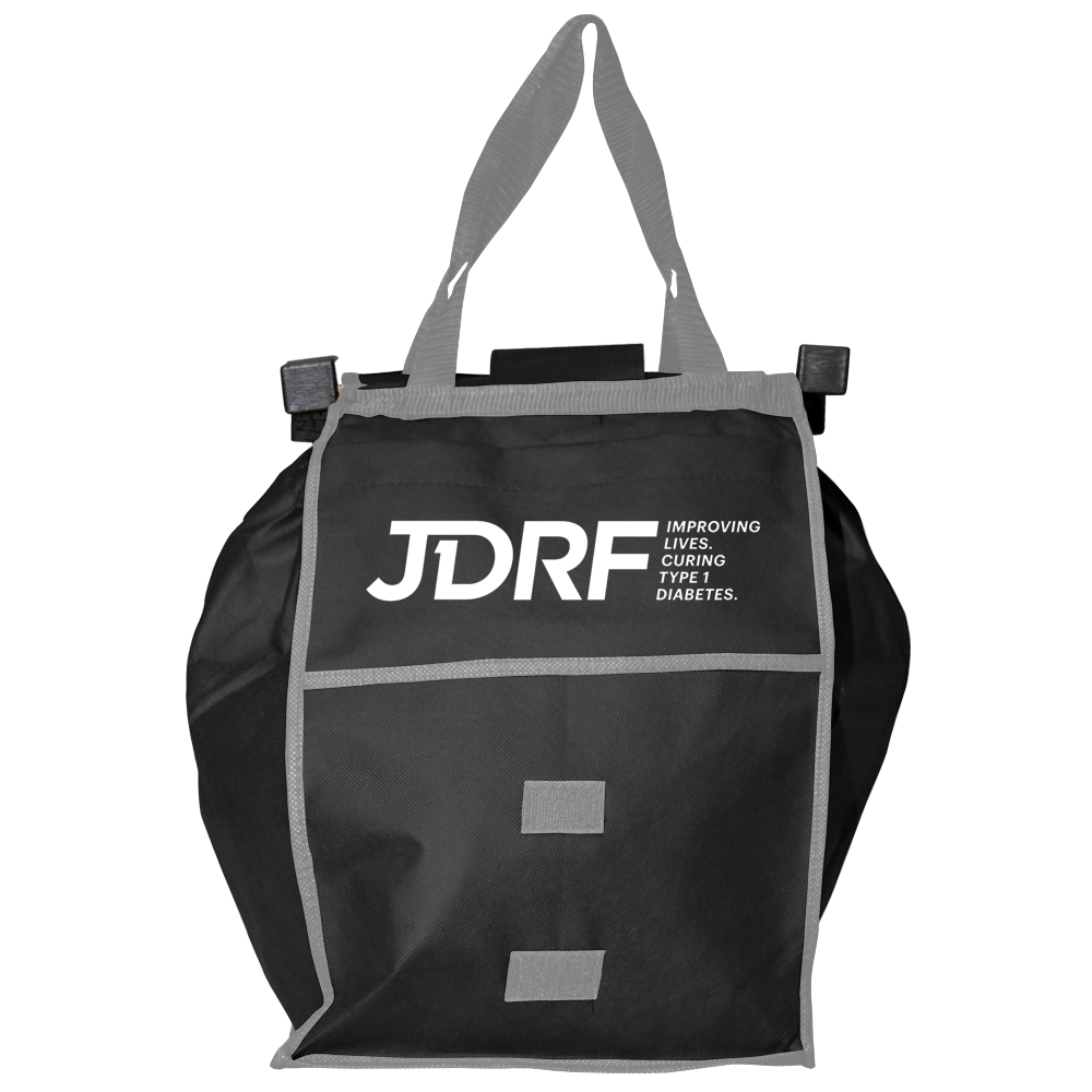 Discover the convenience of using these reusable grocery bags while shopping instead of environmentally unfriendly plastic or paper bags. Made from 100% polypropylene, these bags are food safe, mold, mildew, water and stain resistant and hold up to 40 lbs. Plastic hooks are built into the sides of the bag that lock onto the sides of a shopping cart to hold the bag open for easy sacking. Features large carrying straps, hard bottom to stand bag upright, side pocket to hold coupons or shopping lists, velcro strap to secure bag while transporting preventing spills or damage. Folds up for easy storage when not in use. Available in Blue or Black with the JDRF logo imprinted on the front.