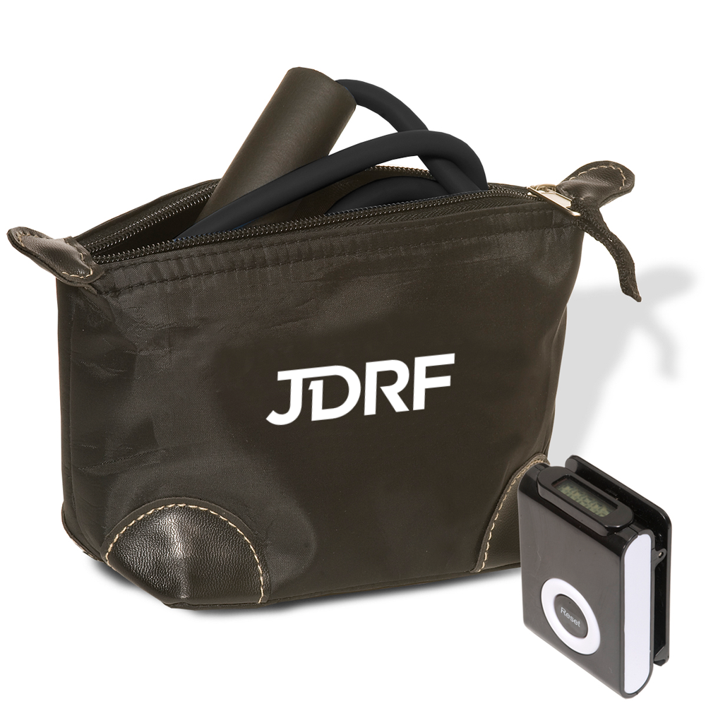 This excercise kit includes a black Clip ‘N Step Meter, an exercise band in a black personal travel pouch. The Pedometer counts the steps taken during your workout, or a day's normal activity. It resets to zero with the push of a button and the display faces up when clipped to your belt. The latex exercise band with EVA foam handles fits easily in purse or gym bag and folds for easy travel. The JDRF logo is imprinted in one color on each piece.