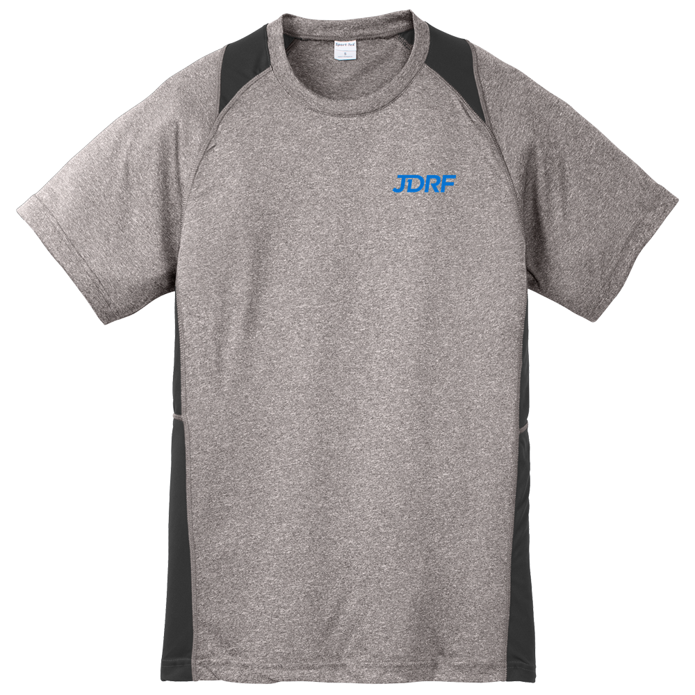 3.8 oz., 100% polyester jersey and interlock panels. Removable tag and raglan sleeves. Good breathability, moisture-wicking performance and value. Available in Vintage Heather/ Black, Vintage Heather/ True Navy or Vintage Heather/ True Royal in youth sizes XS-XL with the JDRF logo embroidered on the left chest.