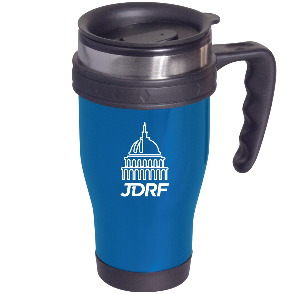 This 16-oz. stainless steel mug features solid stainless steel construction with plastic inner liner for insulation. Features snap-on slide open/closed lid, large-grip handle, and a rubber coaster bottom. Individually gift boxed. Available with the JDRF Capital logo of your choice.