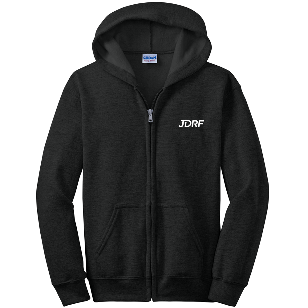 This 8-ounce, 50/50 cotton/poly pill-resistant air jet yarn full zip hooded sweatshirt features double-needle stitching, an unlined hood, and front pouch pockets.  Available in Royal, Sport Grey or Black in youth sizes XS-XL with the JDRF logo embroidered on the left chest.